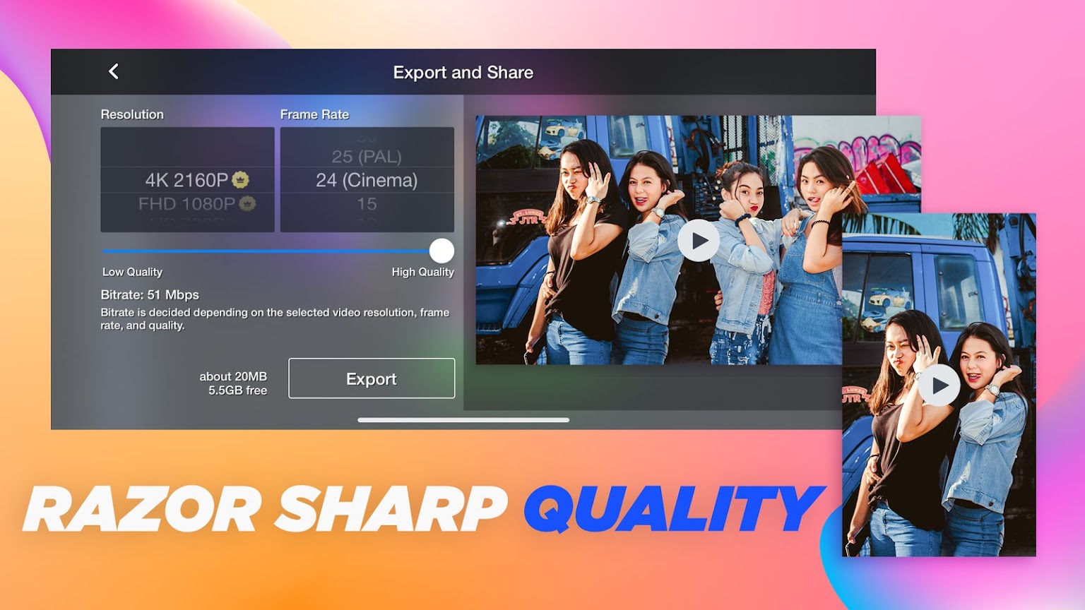 - امکان ذخیره سازی ویدئوهای ساخته شده با کیفیت 1080 پیکسل برروی گالری (فول اچ دی)