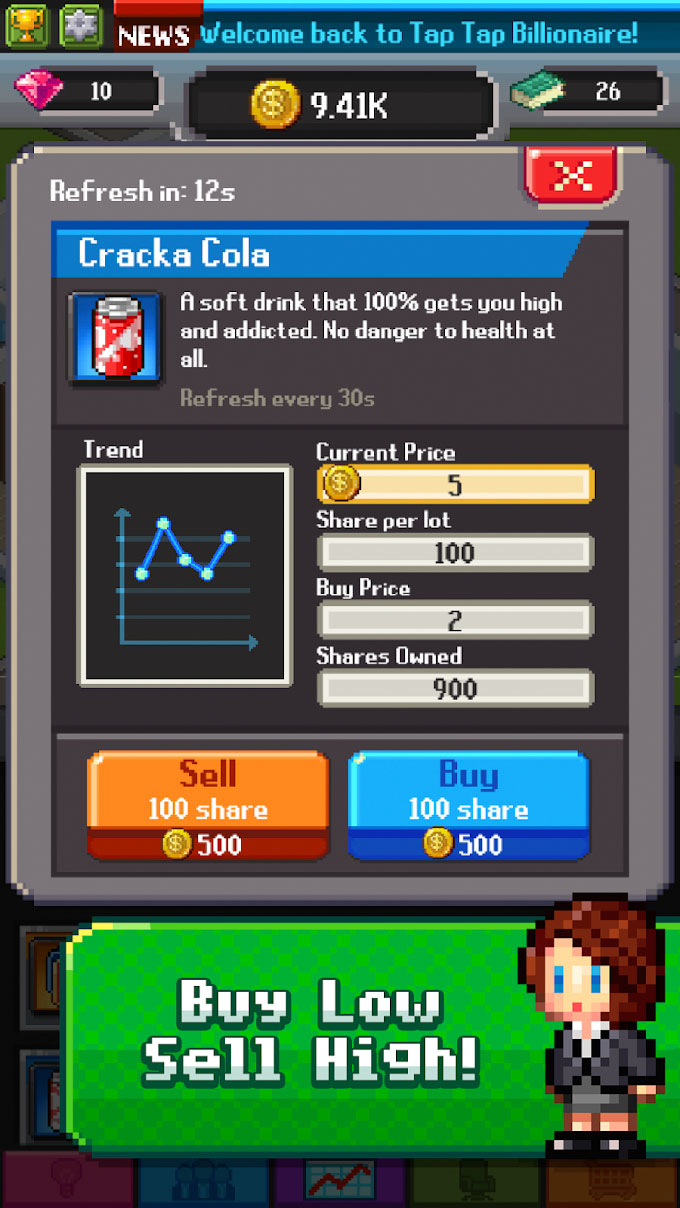 Tap Tap Trillionaire – The Last Quarter بازی محبوب و سرگرم کننده از استودیوی بازیسازی PIXIO برای اندروید است که به صورت رایگان در گوگل پلی عرضه شده و به درخواست شما جدیدترین آپدیت اش به همراه مود برای دانلود عرضه شده و پیش روی شماست! روزی روزگاری آدمی بود که همان شما باشید، شما از خود پرسیدید چطور میتوانم پولدار شوم؟! صدایی از آسمان ها به گوش تان رسید که میگفت تند تند صفحه نمایشگر را لمس کن! از خواب بیدار شدید، صدا از آسمان ها نبود بلکه صدای رئیس تان بود! آن روز که به خانه رفتید با خودتان گفتید اینکه صفحه نمایشگر را تند تند لمس کنید مشکلی ندارد، اما چرا این کار را برای شخص دیگری انجام دهید!؟ چرا آن را برای خودتان انجام ندهید!؟ بازی Tap Tap Trillionaire – The Last Quarter همان جایی است که می توانید این کار را برای خودتان انجام دهید ؛ همین امروز تبدیل به یک تریلیونر شوید! یک شرکت بزرگ را ایجاد کنید و با استخدام کارمندان مختلف تمام تلاش تان را به کار بگیرید تا به یک تریلیونر تیدبل شوید! انواع کارهای مختلف مثل خرید و فروش سهام، استخدام کارمندان مختلف، تزئین محل کار و … همگی در بازی دست به دست هم داده اند تا یکی از زیباترین بازیهای کلیکی اندروید را تجربه کنید!