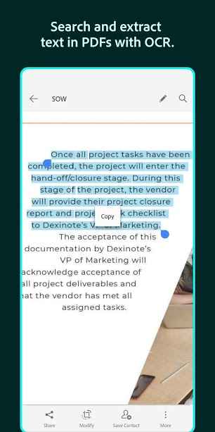 اسکنر ها را می توان جزو پیشرفته ترین ابزار های موجود دانست که هر نوع سند و یا دست نویسی را به نسخه های دیجیتالی تبدیل می کنند. توسعه دهندگان گوناگونی تا کنون اپ هایی را در این زمینه معرفی کرده اند که قادر هستند اسمارت فون های اندرویدی را به اسکنر هایی پر امکانات تبدیل سازند. حتی در برخی از موارد مشاهده شده است قابلیت هایی که توسط این استارت اپ ها ارائه می شود توسط دستگاه های اسکنر چند میلیونی نیز در اختیار کاربران قرار داده نمی شود! یکی از موفق ترین شرکت ها را در این زمینه می توان ادوبی، خالق برنامه معروف فتوشاپ دانست. Adobe Scan: PDF & Business Card Scanner with OCR عنوان اپلیکیشن اسکنر هوشمند شرکت ادوبی Adobe مخصوص تبلت و گوشی اندروید می باشد که در گوگل پلی منتشر شده است. هر ان چیزی که شما برای یک اسکن بی نقص به آن نیاز دارید در این اپلیکیشن موجود می باشد؛ به صورتی که کافی است دوربین گوشی اندرویدی خود را در بر روی اسناد کاغذی گرفته و یک نسخه دیجیتال و بسیار با کیفیت را به سرعت دریافت نمایید. اسناد اسکن شده توسط برنامه فوق در فرمت پی دی اف در اختیار کاربران قرار می گیرد که علاوه بر ذخیره سازی آن ها در حافظه قادر به اشتراک گذاری شان با دوستان خود هستید. از دیگر امکانات موجود در این اپلیکیشن می توان به تکنولوژی فوق العاده OCR اشاره نمود که کاربران را قادر می سازد تا متن های موجود در تصاویر و یا فایل های PDF را به آسانی هر چه تمام تر استخراج نمایند.